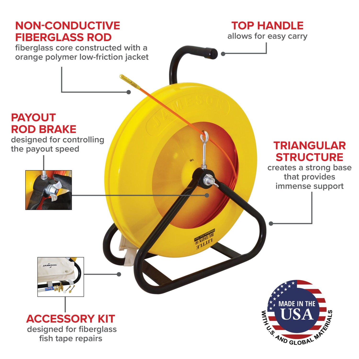 Jameson Little Buddy Fish Tape | 3/16" Fiberglass Rod | 150'–300' Conduit
